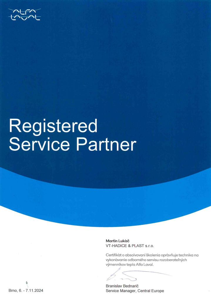 Spoločnosť VT Hadice & Plast s.r.o. je oficiálnym registrovaným servisným partnerom spoločnosti Alfa Laval.